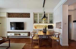 客厅是整个空间的焦点,简约的沙发搭配原木色的茶几,营造出温馨舒适的氛围。电视背景墙采用白色乳胶漆,简洁大方,与整体风格相得益彰。而餐厅与厨房的隔断则巧妙地利用了高脚凳,既节省了空间,又增添了趣味性。